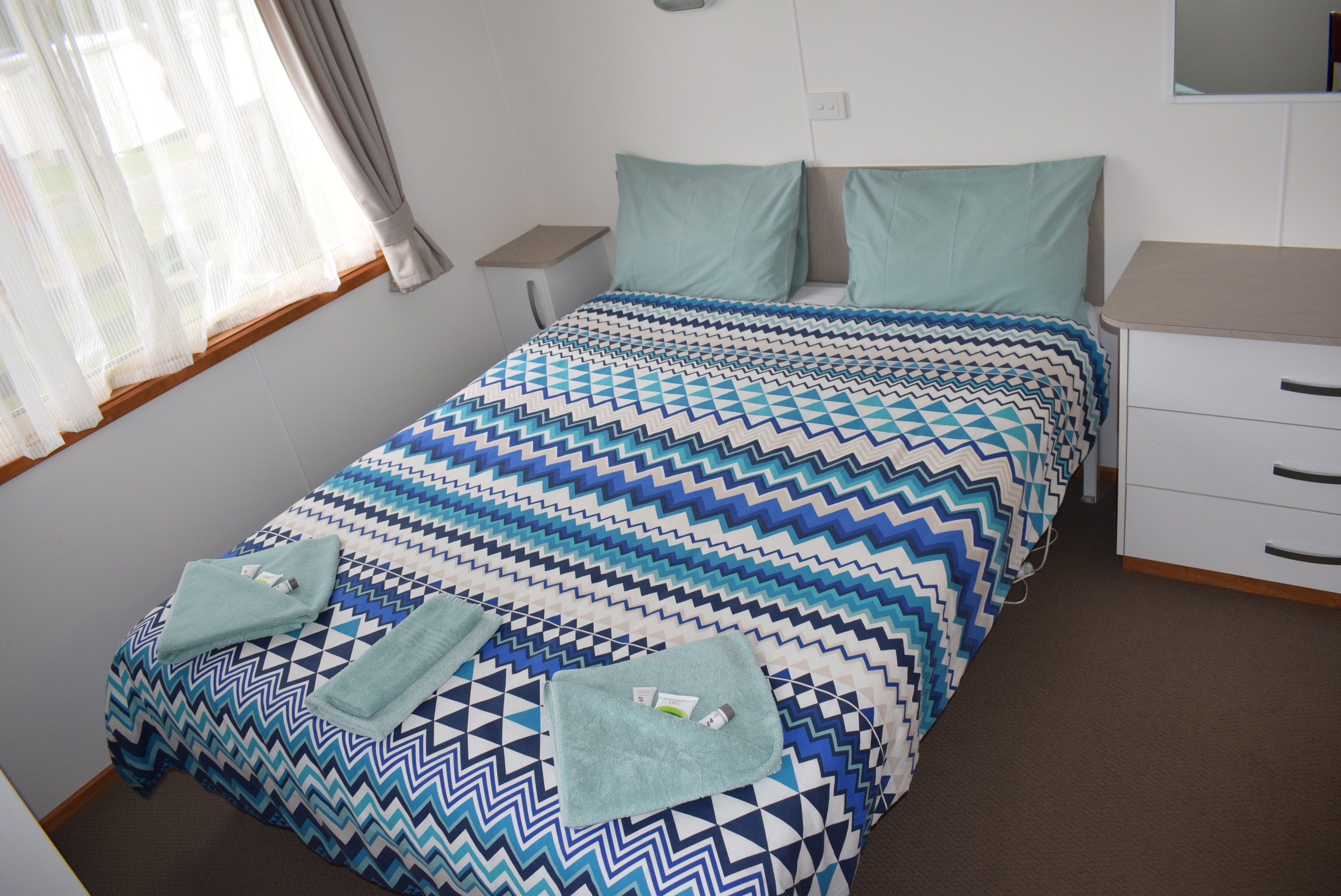 This air-conditioned cabin has 2 bedrooms with 1 queen bed in the main bedroom and 2 single beds in the 2nd bedroom. There is a kitchenette, sofa and a large TV.